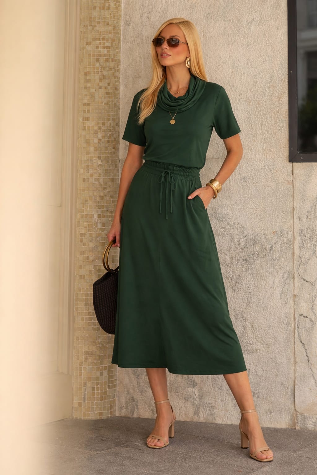 Conjunto moletinho, blusa gola boba e saia midi com elástico no cós.