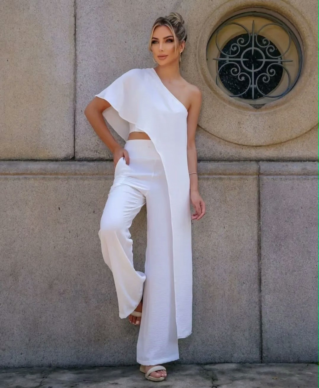 Conjunto calca com cos de elástico atrás, top assimétrico fechamento em zíper lateral. Tecido duna.