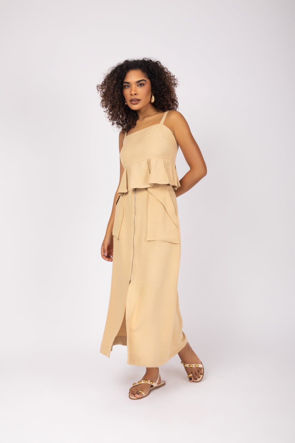 O comprimento da saia é midi com bolsos em detalhes, com um toque delicado e zíper frontal.