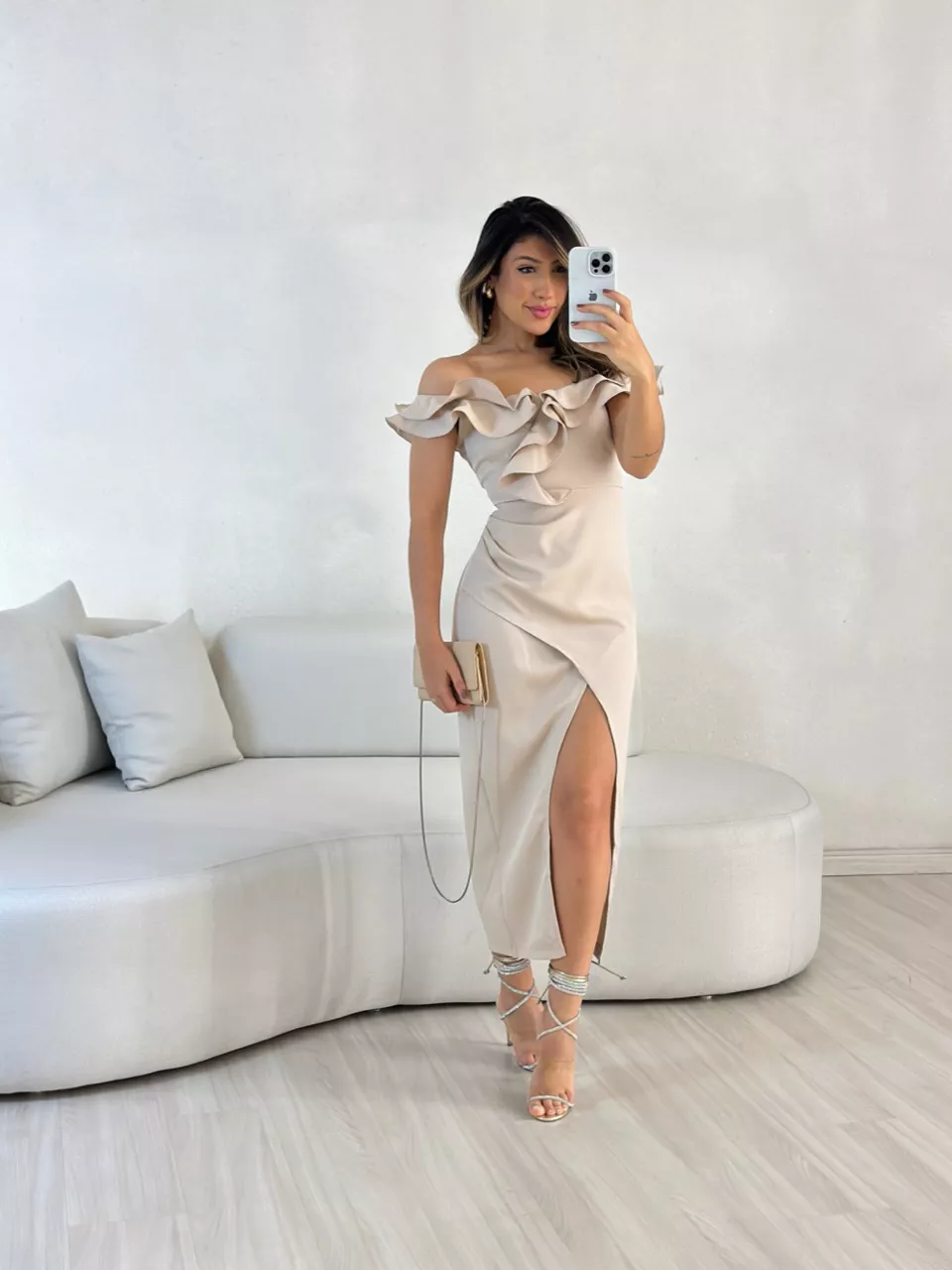 Vestido midi, fenda frontal detalhe babado no colo.